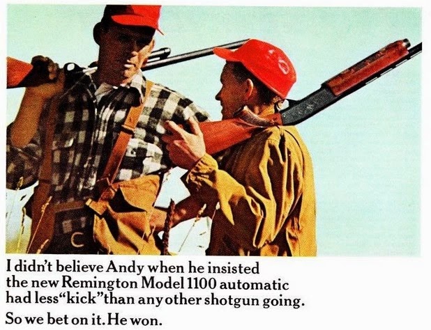 Dopey gun demonstrations illustrate high technology in gun manufacture and the values of American manhood.  Shotguns are fired repeatedly, thrown into a stream and tested mercilessly in a high tech laboratory. We are assured that the model 1100 is capable of discharging live rounds in any situation. Ends with skeet shooters and huntsmen happily shooting things to bits with wild abandon.