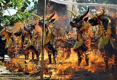 Among the Hindus of Bali, cremation is thought to release the soul for its journey to Nirwana. The joyous and spectacular ceremony shown in Island of the Spirits is reserved for high-born princes today. Hugely costly, the preparations for the cremation of Prince Sudharsana include the building of fantastic effigies and a tower nine stories high. Eight hundred men carry the tower in procession through the hundred thousand celebrants. The body of his small granddaughter and the souls of twenty-seven villagers accompany the prince. At the close of this long and auspicious day, when towers and effigies together with coffins, food, money, and incense have long been consumed by flames, when the crowds have departed, the ashes of the dead will be cast into the sea. Only then will the newly liberated spirits rise unrestrained to join the heavenly soul of all the universe, Nirwana.