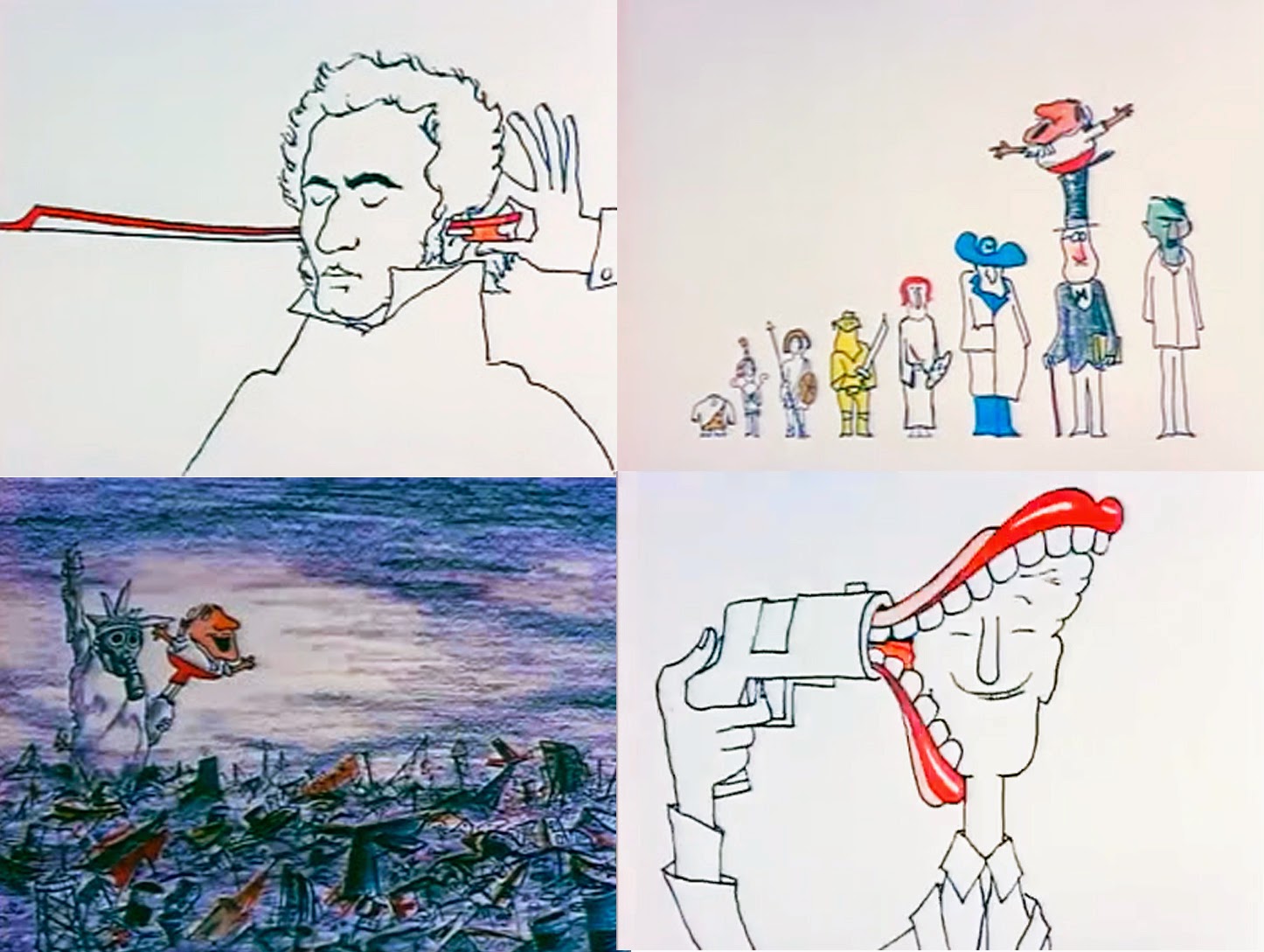 Another eye-popper from Bruno Bozzetto. In twelve animated vignettes, Bozzetto creates brilliant visual, satirical and comical treatments of some of man's great preoccupations: war, omnipotence, religion, democracy, advertising, drugs, television, hunger, "conquest" of nature.