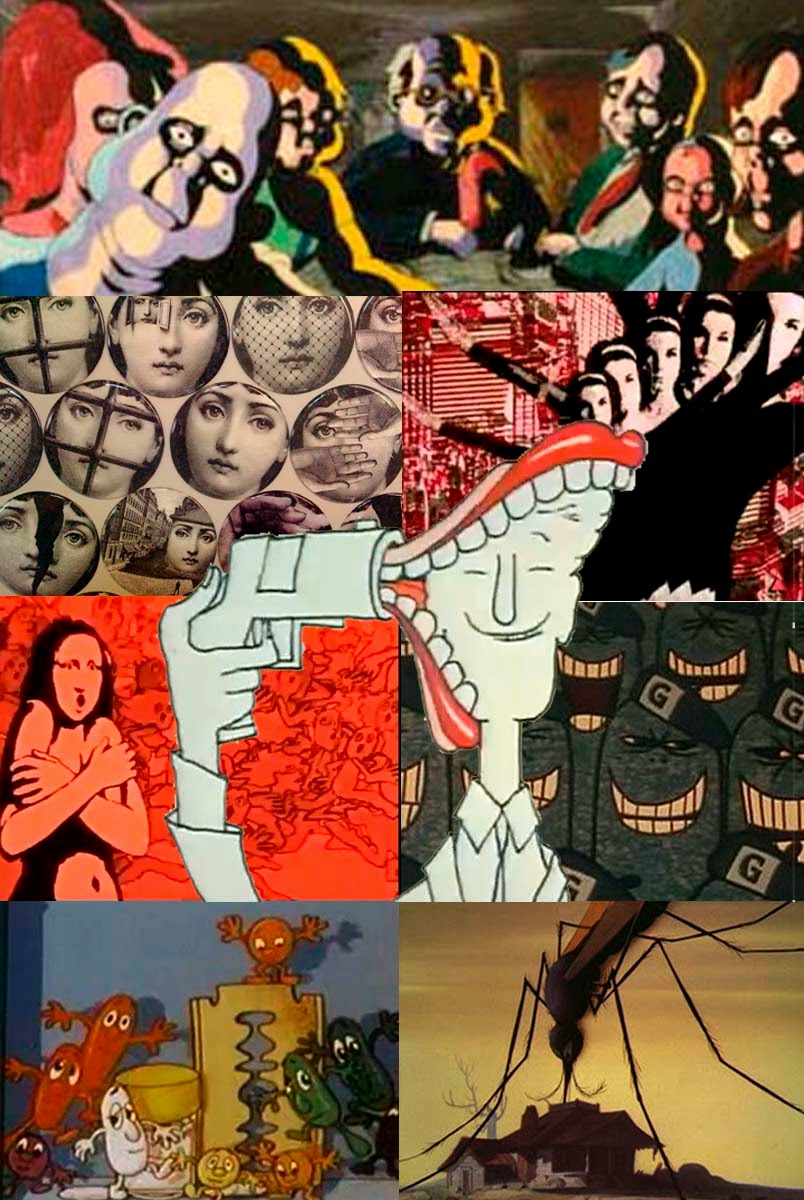 starts with traditional comic-style animation until the factory-working family man goes to sleep and unleashes his subconscious thoughts sending him into a battleground of situations.  His bizarre dreams lead him to Freudian juxtapositions of sex and gruesome fascism. Bozzetto utilizes a number of animation styles including optical printing and pop art imagery and a wild soundtrack by the ultra-lounge master Franco Godi to create the most unforgettable 9 minutes of cartoon history.