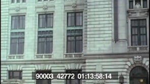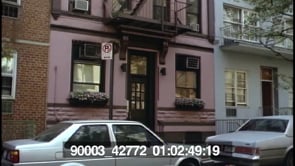 CU Entrance brick apt. building, taxis pass, mother and child exit