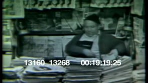 A man sits in his newspaper stand surrounded by stacks of papers. He…