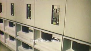 Man at IBM RAMAC machine and roll of tape turning. The read/write head…