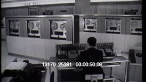 A man sits at a computer console in a 1950s computer room. There are…