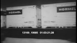 Workers put boxes of Hormel bacon into refrigerated trucks. Train…