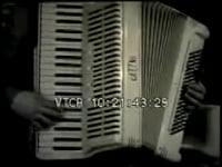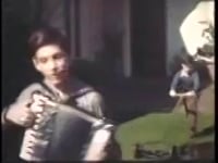 boy plays accordion in yard, home movie