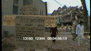 MCU of woman talking to off-camera reporter, crowd behind her. Workers…