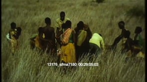 Africans surrounding dead wildebeest while safari assistants carve up…