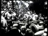 Soviet soldiers march in unison down the street, men carry flags, play…