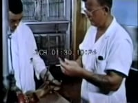 Man shakes (jerks) bottle, opens top and foam snakes out.