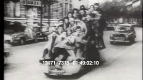 LS of a large amount of young people piled up on top of a moving car.…