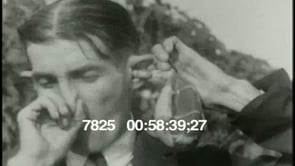Stuntman with big ears pinches his nose and inflates a balloon with his…