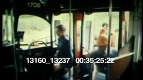 A blue trolley drives through a suburban neighborhood. Shots of blue…