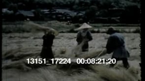 Japanese countryside, rice-fields; farmers wearing straw hat; oxen;